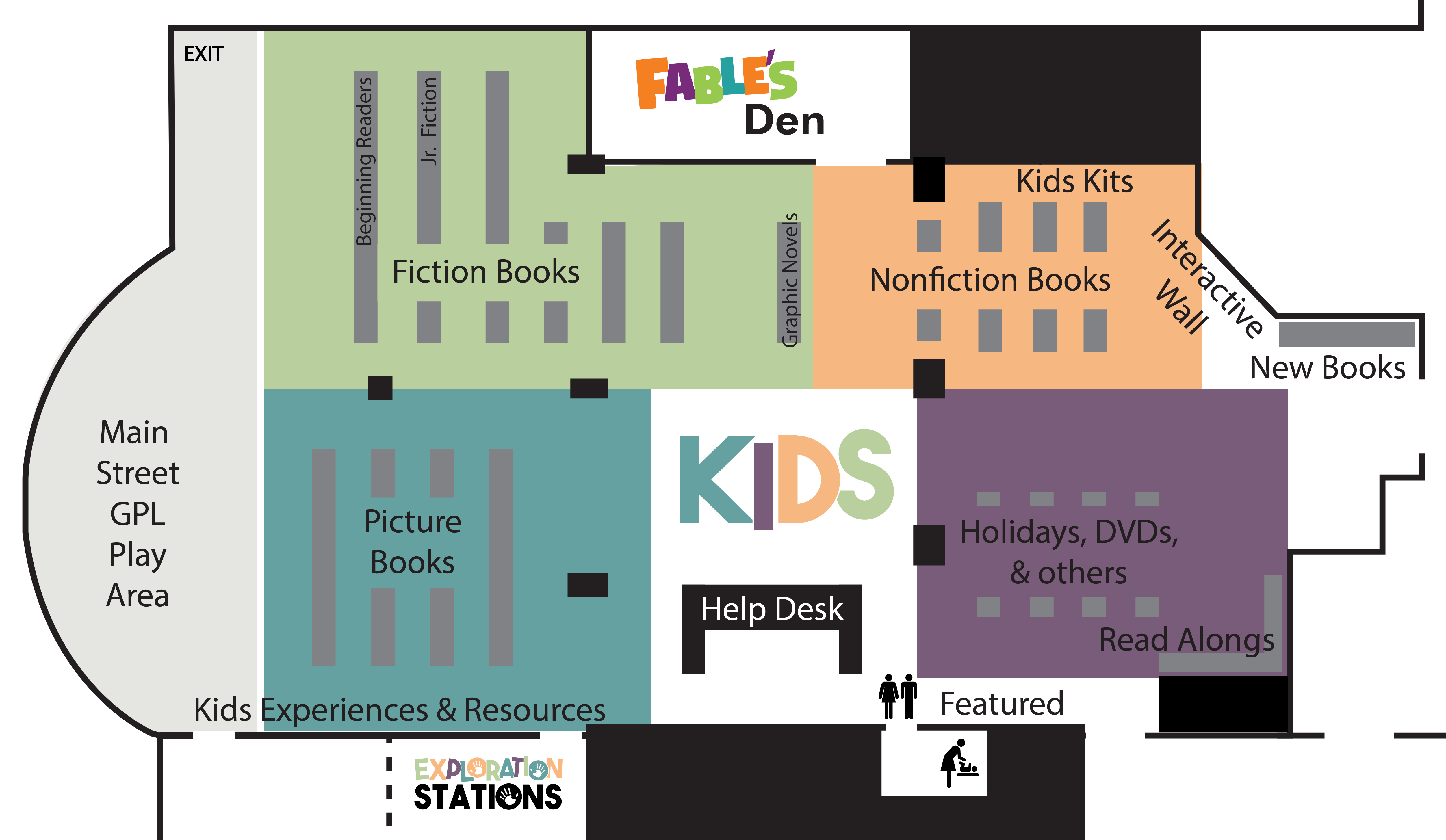 With so many sections in the Kids Department, we've broken up areas into different colored zones to help you locate what you need as easily as possible! Scroll past the map to see details about what collections are included in each zone.