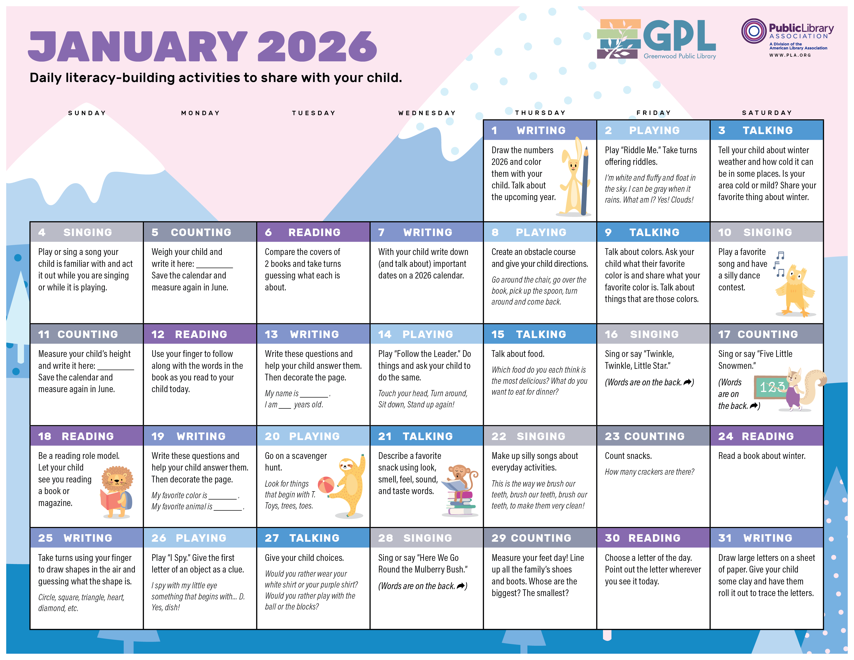 Download our 2026 Early Literacy calendar for daily early literacy ideas!